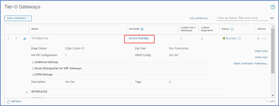 Login to NSX Manager >> Networking >> Tier-0 Gateway >> Click on Active Standby to identify status. Sa-nsxEdge-01 edge node will be reflecting as Unknown.