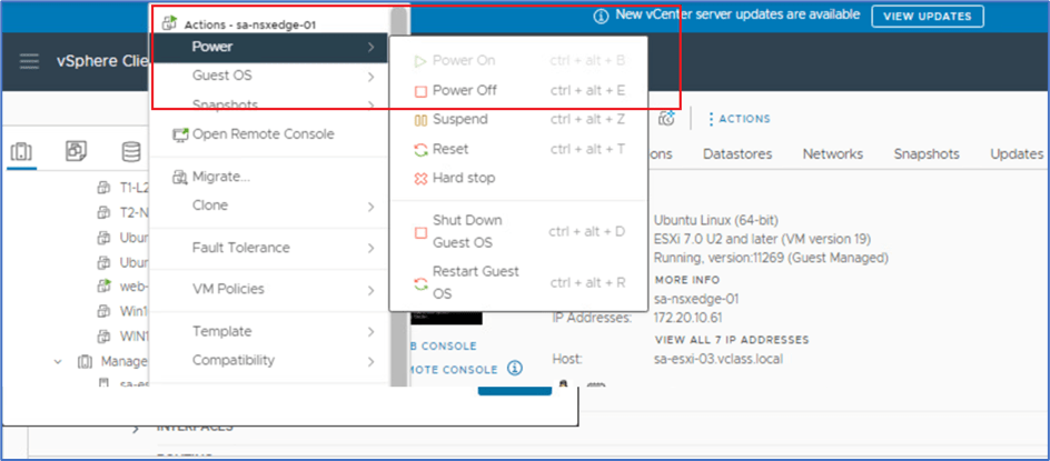 Login to Vcenter server, and power off Sa-nsxEdge-01 VM to simulate Edge Node failure.