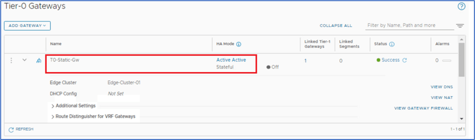 Login to NSX Manager >> Networking >> Tier-0 Gateway >> Click on Active Active to identify status. Sa-nsxEdge-01 edge node will be reflecting as Unknown.
