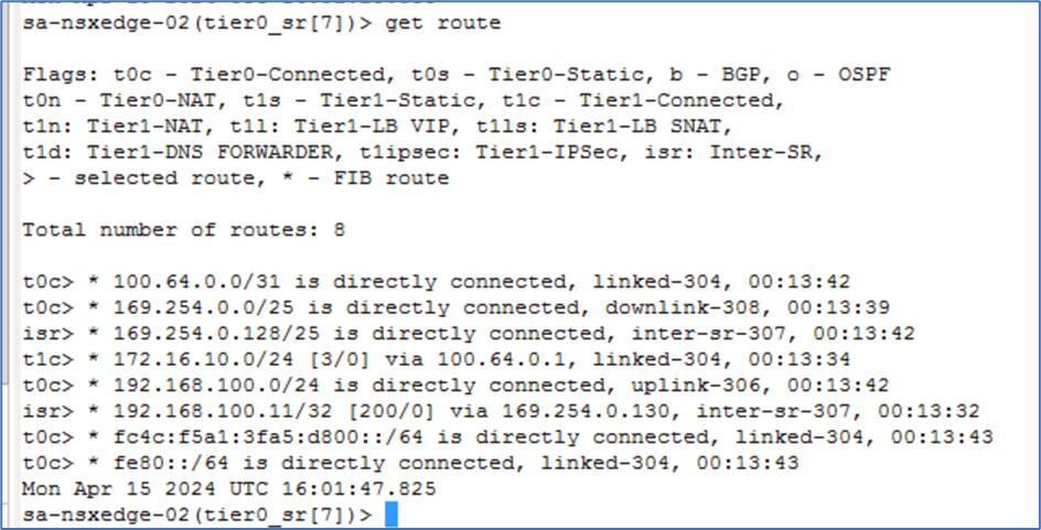 SSH to both NSX-T edge gateway and login to Tier-0 SR VRF to validate routes. Verify that route for NSX-T overlay subnet (172.16.0.0/16) is not present.
