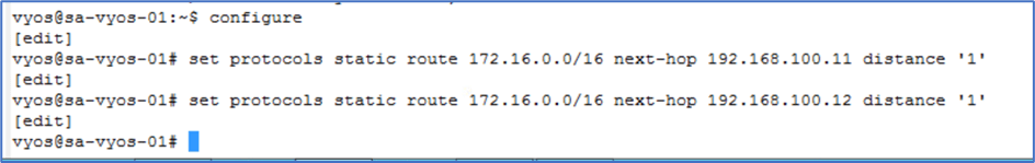 Login to VYOS router and apply Static routes for Overlay Network (172.16.10.0/24) towards both interfaces of NSX-T Tier-0 router.Note : You might have another underlay router like Cisco CSR . Please validate vendor configuration before applying changes.
