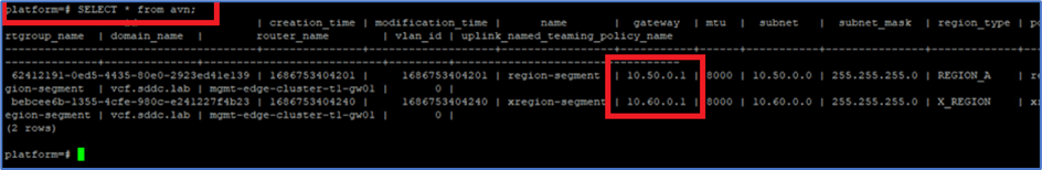 SDDC Manager Database updates entries of AVN & NSX-T edge clusters in table avn & nsxt_edge_cluster and nsxt_edge_cluster_and_nsxt_cluster respectively. AVN use default edge cluster deployed in Management domain from SDDC manager. We will connect to SDDC platform database to edit those tables.