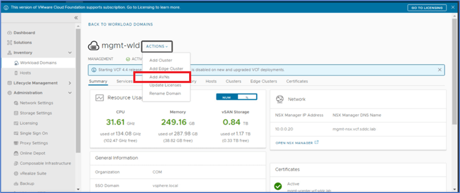 Now SDDC manager will enable option to ADD AVN.