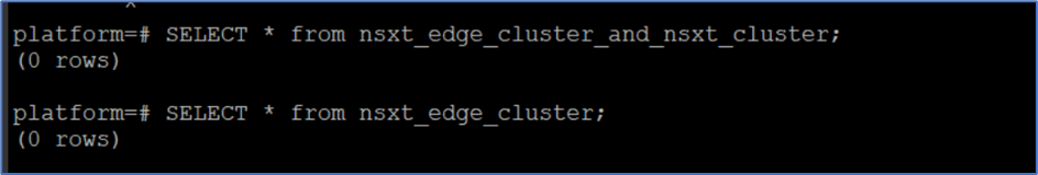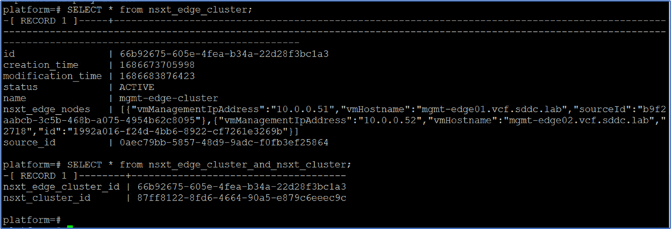 SSH to SDDC manager with root and connect to platform database. Validate nsxt_edge_cluster and nsx-edge_cluster_nsxt_cluster table information.