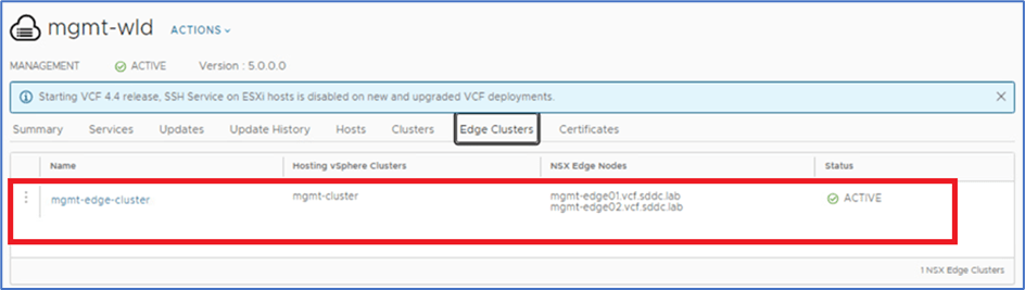 Now click on Edge cluster Tab and validate NSX-T edge cluster details. We have edge cluster mgmt.-edge-cluster with two node deployment.