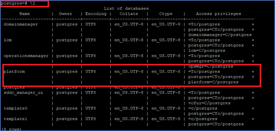 Enter command \l to list all databases in SDDC manager.