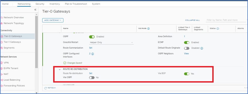 Select Tier-0 and Tier-1 Subnets which needs to be advertised in OSPF and click on APPLY to save configuration.