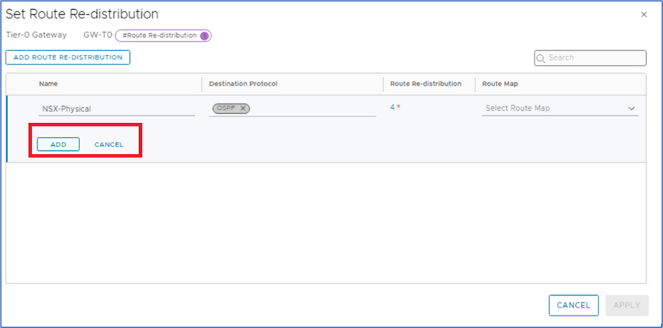 Click on ADD ROUTE RE-DISTRIBUTION. Provide below information and click on SET.