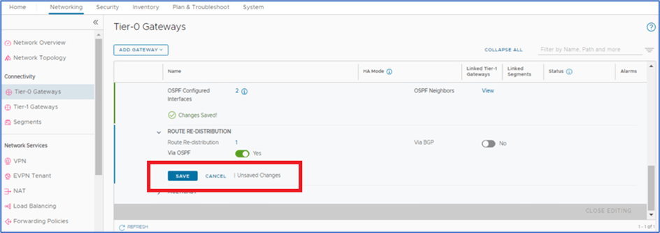 Select Tier-0 gateway (Created in previous steps ) and click on save. Scroll down and click on Close Editing.