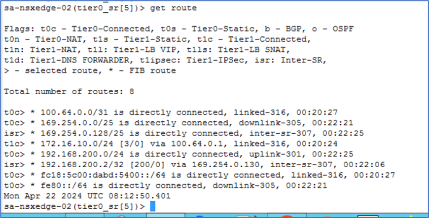 SSH to both NSX-T edge gateway and login to Tier-0 SR VRF to validate routes. Verify that route for Admin PC subnet (172.20.10.0/24) or default route is not present towards Physical router VLAN 200 Gateway IP 192.168.200.1