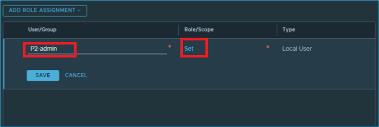Enter user name (P2-admin) and click on SET under Role/Scope