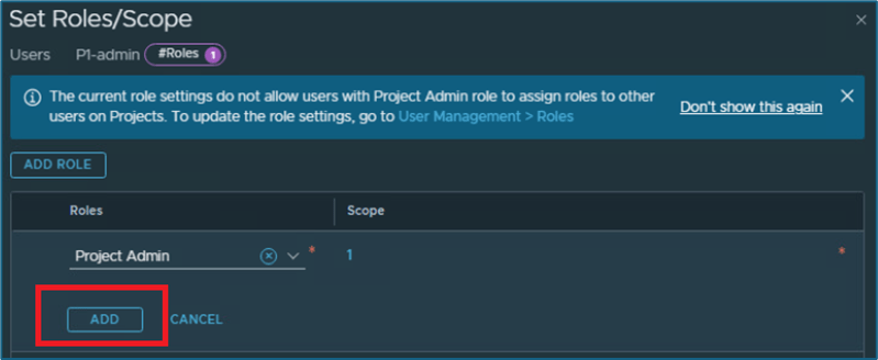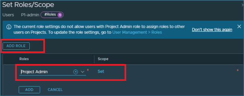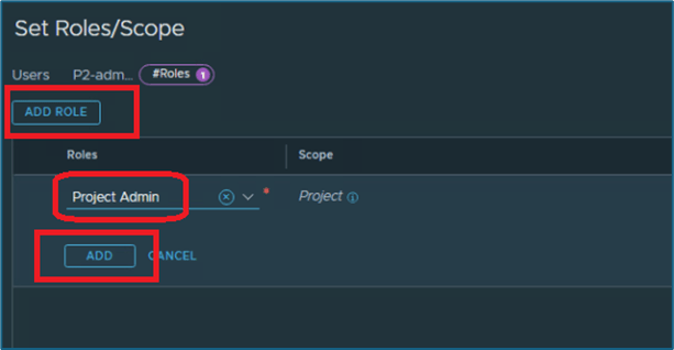 Delete other roles, if assigned to that user . Click on ADD ROLE to add assign roles. Select Project admin from list and then click on SET under scope to select project .