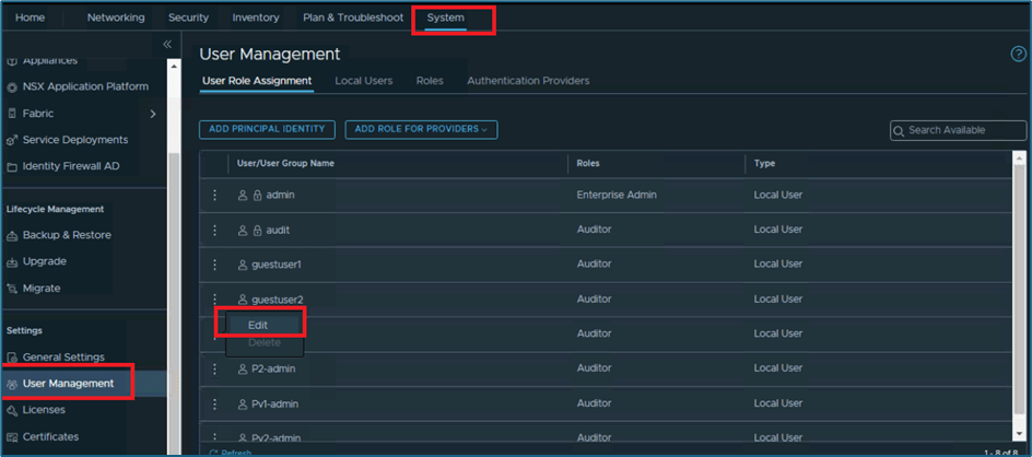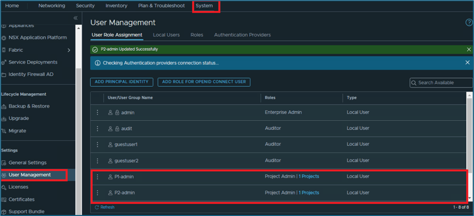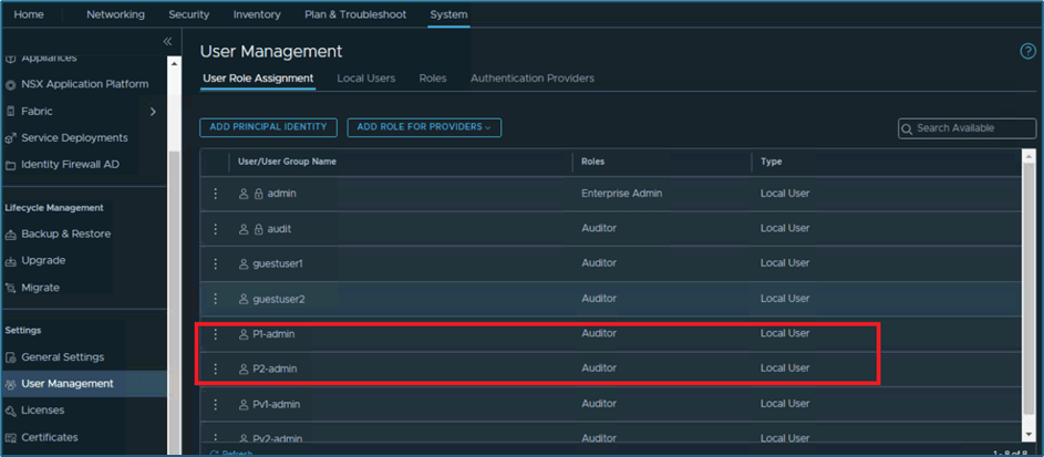 In NSX, You can assign users to project either from project manage screen or from user management . We have 2 users P1-admin and P2-admin ,which will be assigned to projects Project1 and project 2 respectively with project-admin role. Refer below screenshot, both users have auditor role only and in sub-sequent steps we will assign those users to projects.