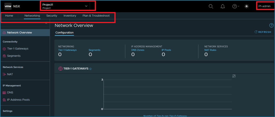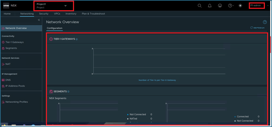 Please refer below screenshot where we have logged into NSX with project user P1-admin user which is mapped with Project 1 only. Here you can see that User have access to limited resources. In networking Tab, you can validate Project user doesn’t get access to Tier-0 routers.
