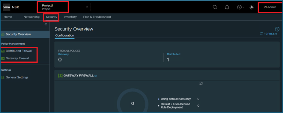 If we talk about security tab, Project admin can create Distributed firewall and Gateway firewall (only for Tier-1 routers created in project). Other security features like IDS/IPS are not available in Project.