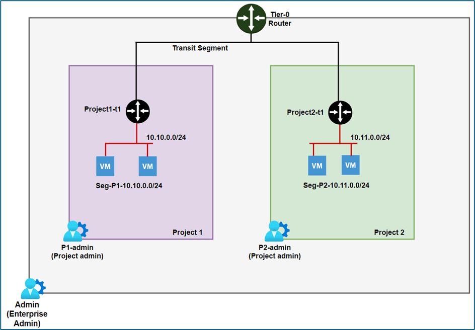 We will have NSX-T infrastructure with 2 Projects configured Project1 and Project 2 . Each project has 1 Tier-1 router with logical segment attached.
