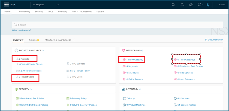 Refer below screenshot from enterprise admin console, we have 2 projects and 1 tier-0 router and tier-1 router is not configured