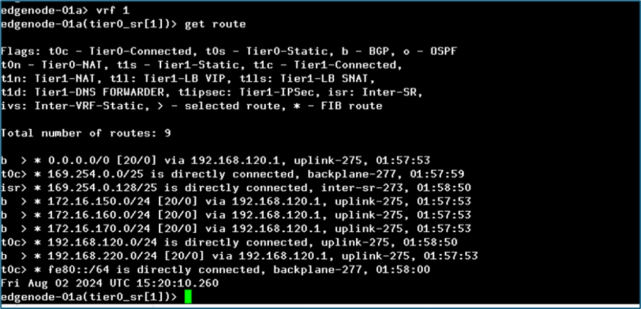 Now login to VRF 1 to check routes on Tier-0 router. Here you will not be getting routes