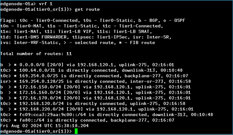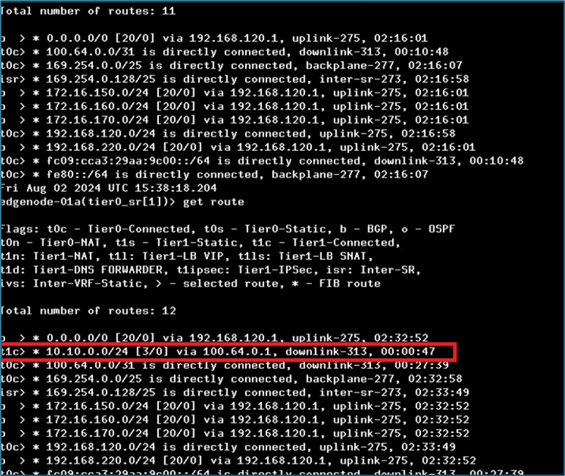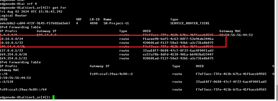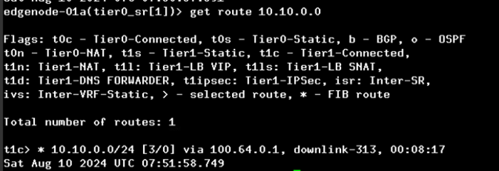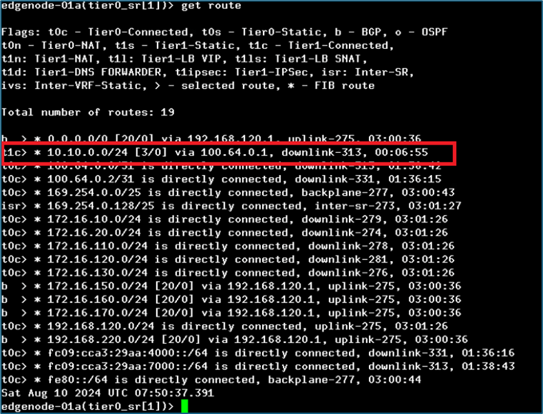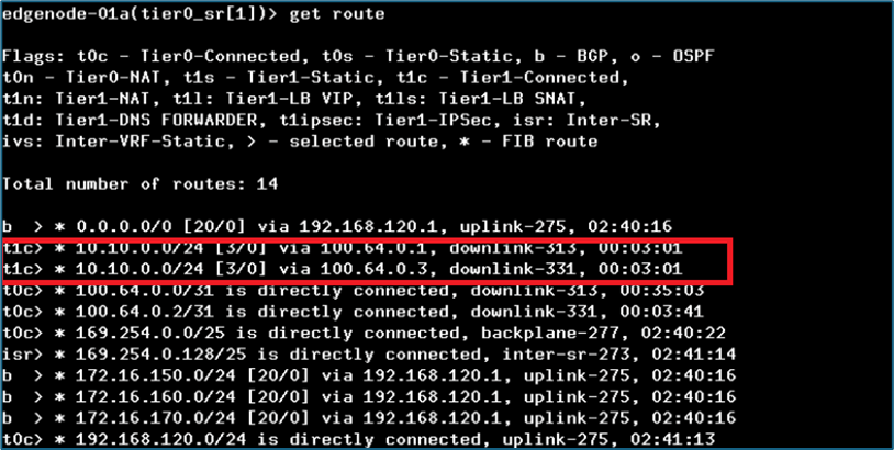 Now we will login to NSX T edge Tier-0 SR router CLI and validate that subnet 10.10.0.0/24 is being received from 1 tier-1 router