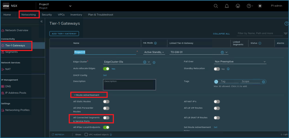 When project user creates Tier-1 router, it doesn’t advertise all routes tier-0 router. Users have to enable configuration at tier-1 router. This configuration can also lead to situations where two project users can configure same subnet on their projects, as they don’t have visibility for other projects.