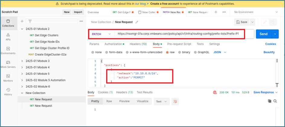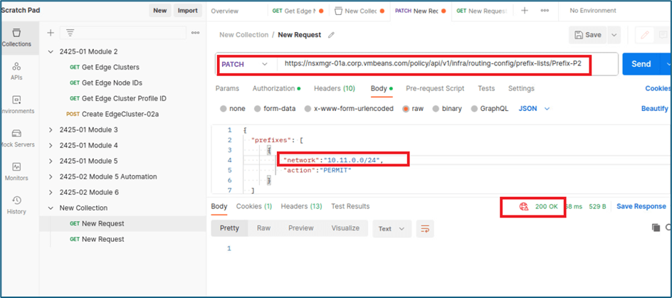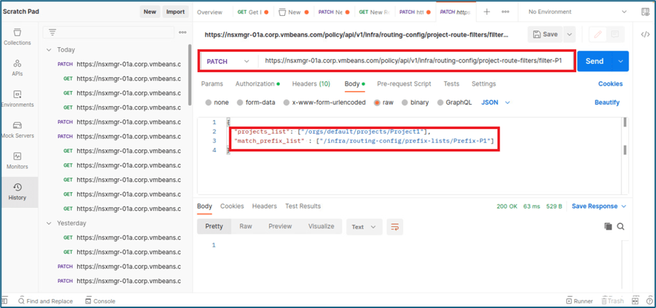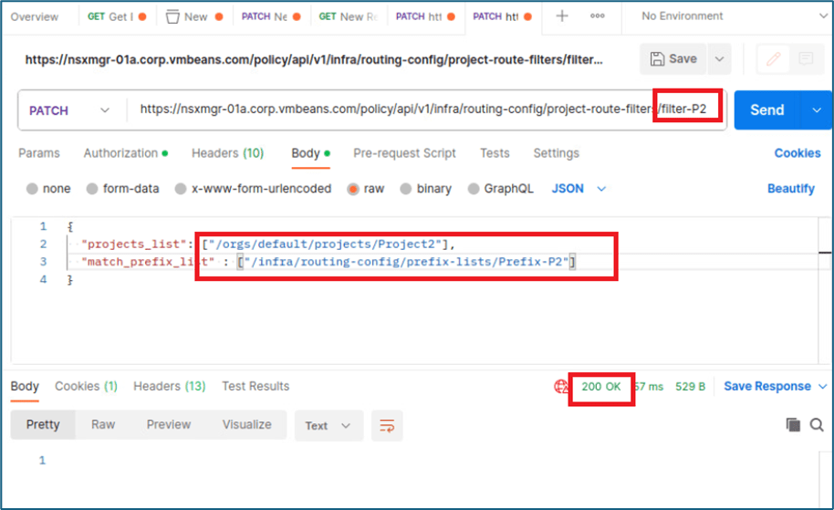 To create prefix list via Postman API, we will use PATCH function . We will create Prefix list Prefix-P1 and Prefix-P2 for both projects respectively.