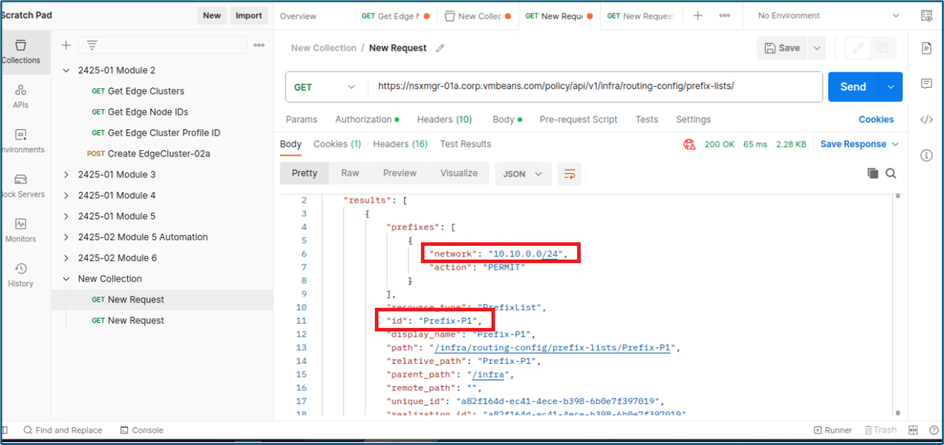 Note : Prefix list name used in PATCH API will be prefix list id , i.e we have created prefix list Prefix-p1 , so Prefix list id is Prefix-P1. You can refer below screenshot to validate prefix list id
