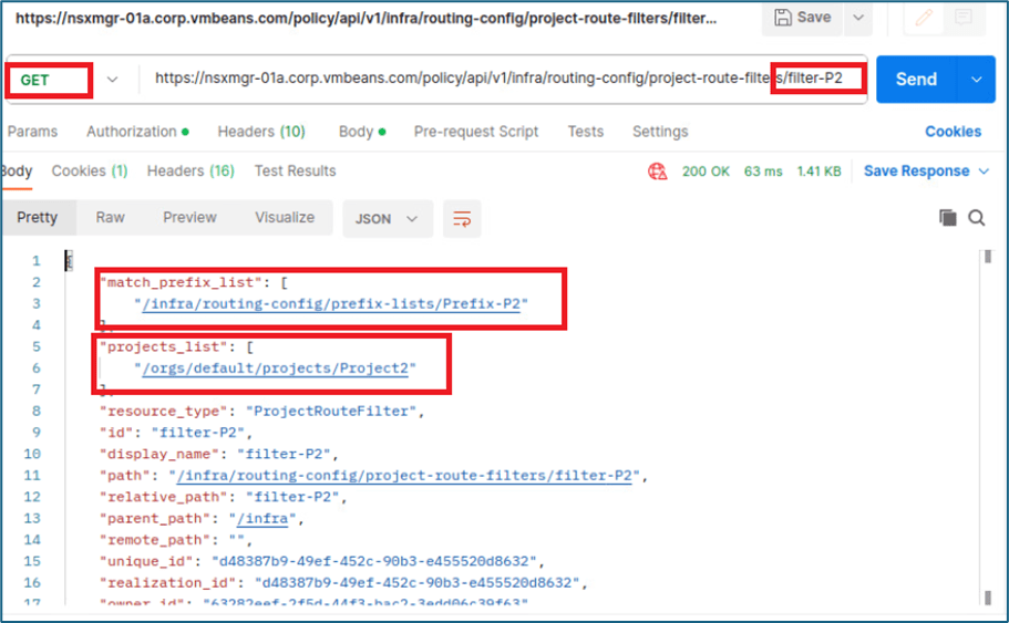 Refer below screenshot, we have run GET API for router filter filter-P2. We can see this filter is using Prefix list prefix-p2 and following with project details