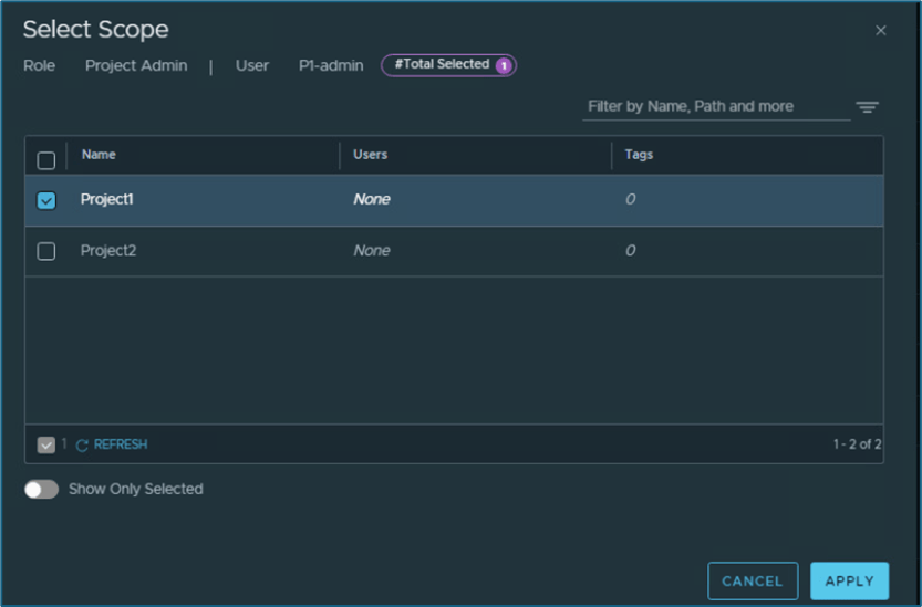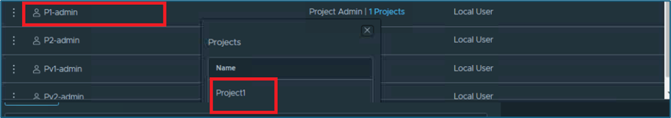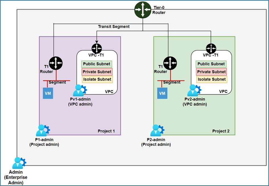 In Project1, the user P1-admin will have Project admin role while the user Pv1-admin will have VPC-admin role. Similarly, In Project2, the user P2-admin will be assigned the Project admin role, and the user Pv2-admin will have the VPC admin role which are assigned at project and VPC level respectively.