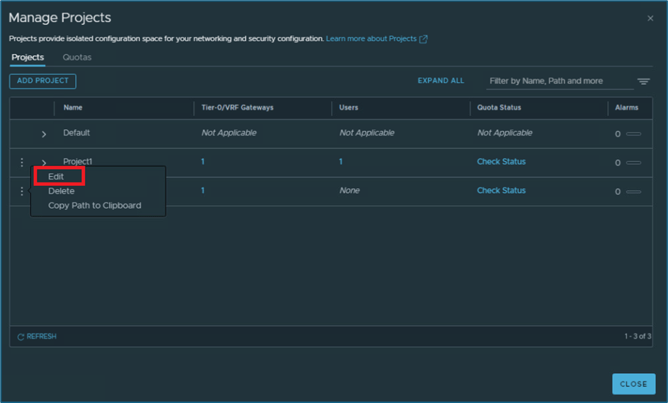 Login to NSX-Manager and go to project manage screen. Click on Manage and then click on 3 vertical dots for project where you want to make changes
