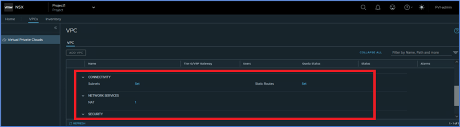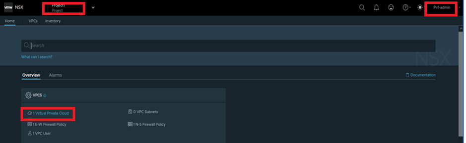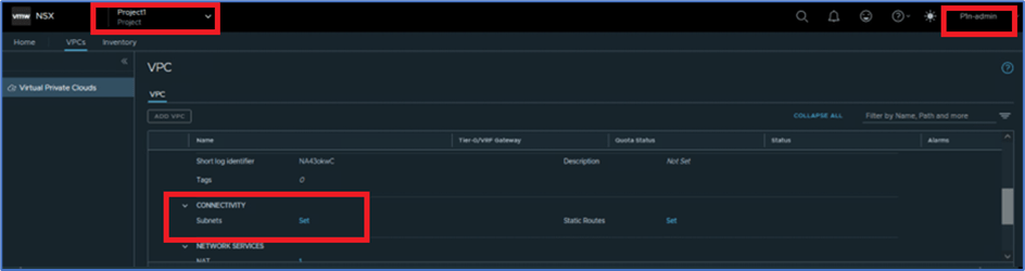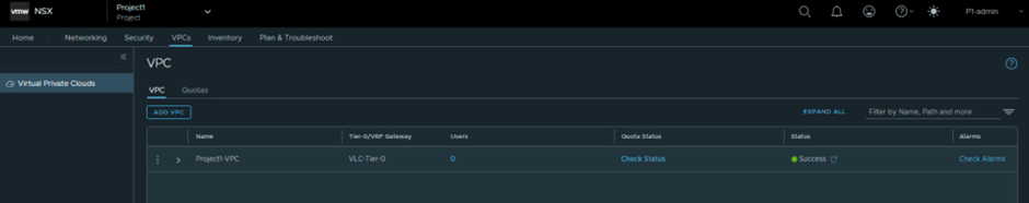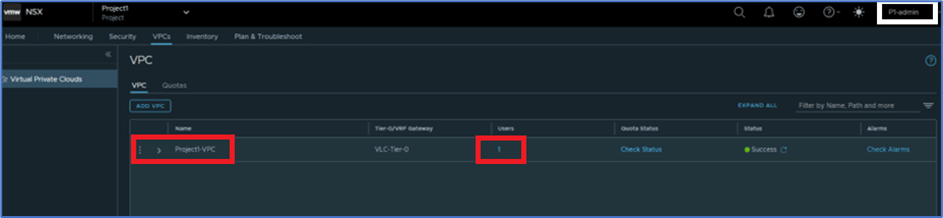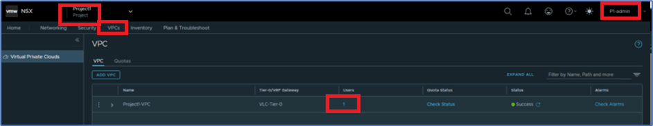 We have logged into NSX-T with User:P1-admin which is assigned with Project1 , and validated that there is no VPC configured. Refer below screenshot to find VPC and User details.