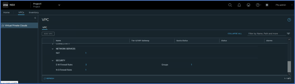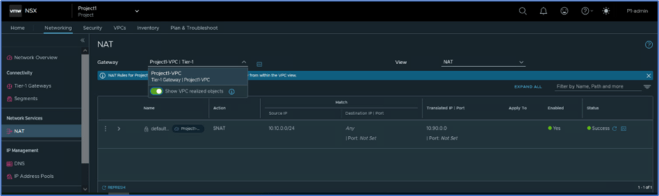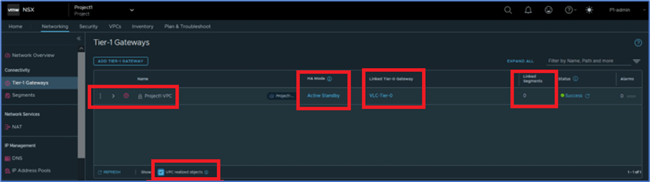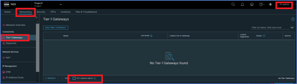 To validate VPC Tier-1 gateway , Login NSX manager with Project admin user (P1-admin) and navigate to Networking >> Tier-1 gateway . By default , you will not get any VPC router details . You have click on VPC related objects .