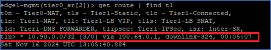Run command get route | find t1 to filter route from tier-1 gateway only. In our example , we got below output(Refer screenshot). Tier-0 gateway is receiving 10.90.0.0/32 as t1n routes , which means Tier-1 gateway NAT routes.