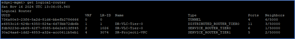 Login to NSX Edge VM and find VRF ID for Tier-0 gateway Service router , with command get logical-routers. In our example VRF id was 2 and then type command: VRF 2 to get login to Service router .