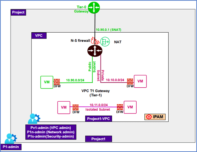 In this blog, we will use the topology shown in the diagram below. Here, an NSX Project (Project1) has been created, with the user P1-admin assigned the role of Project admin. We will deploy a VPC (Project1-VPC) with an existing Tier-0 router, an external subnet (10.90.0.0/24) for NAT and Public Subnet, a Private IP block (10.10.0.0/24), and an isolated subnet (10.11.0.0/24). Additionally, we will assign local users P1n-admin (Network admin) and P1s-admin (Security admin) to test and validate user role assignments.