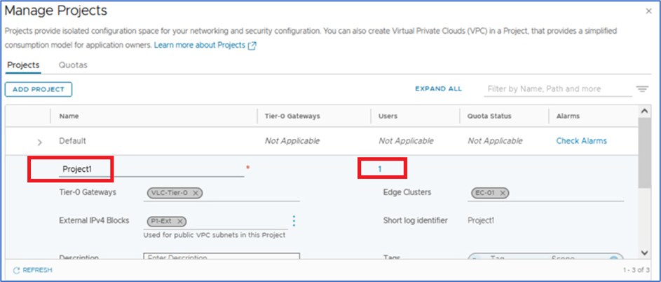 Note : We have already configured Project1 and assign user:P1-admin to project with User role: Project admin and external subnet:P1-ext (10.90.0.0/24). VPC will inherit external subnet from this configuration while VPC configuration workflow.
