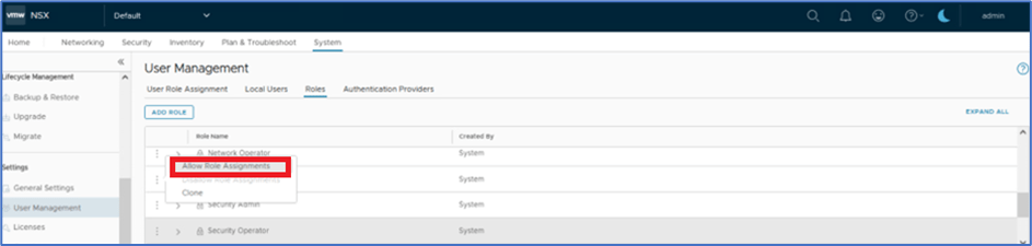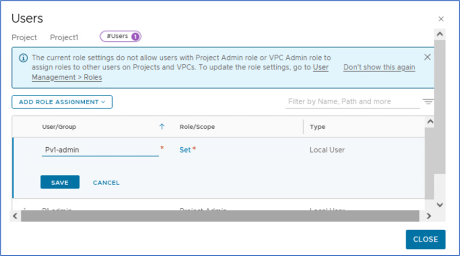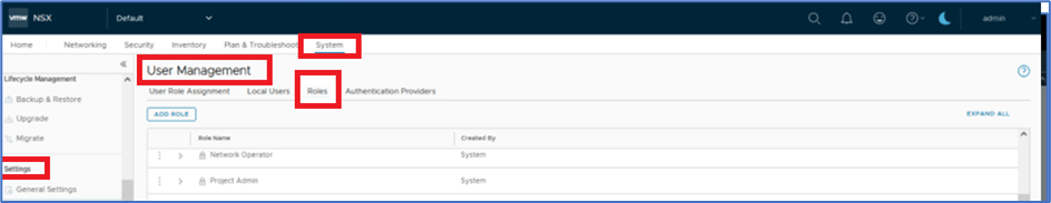 To provide access to Other users (Project and VPC admin) , login NSX manager with Enterprise admin. Navigate to System >> Setting >> User Management >> Roles In our example, We will apply changes for Project admin role and then assign User:P1n-admin with user role Network admin to VPC.