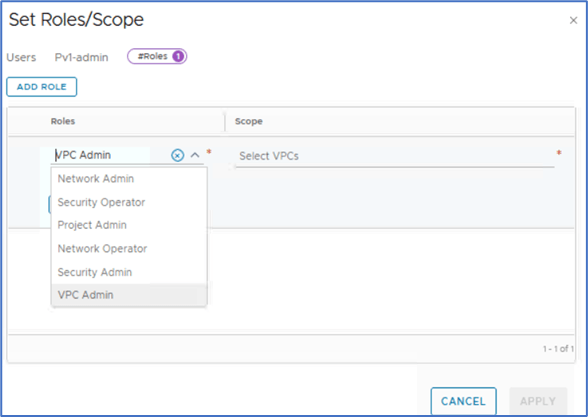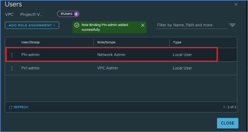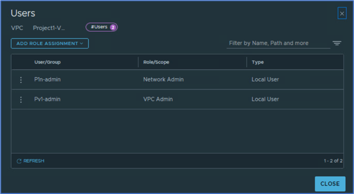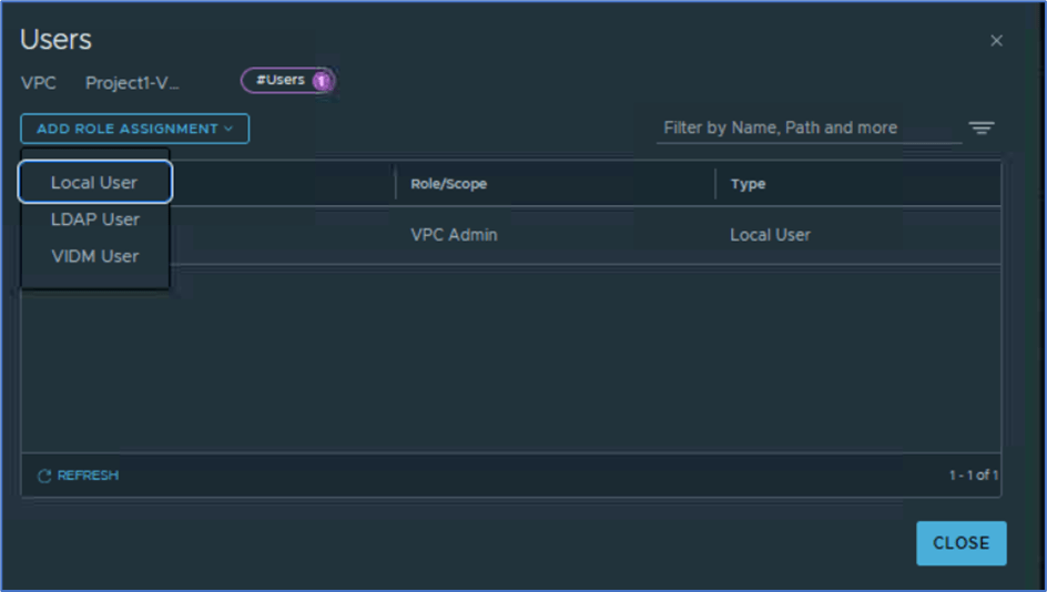Project admin can assign existing users (Local or LDAP) with VPC admin or specific roles and scope them to one or more VPC