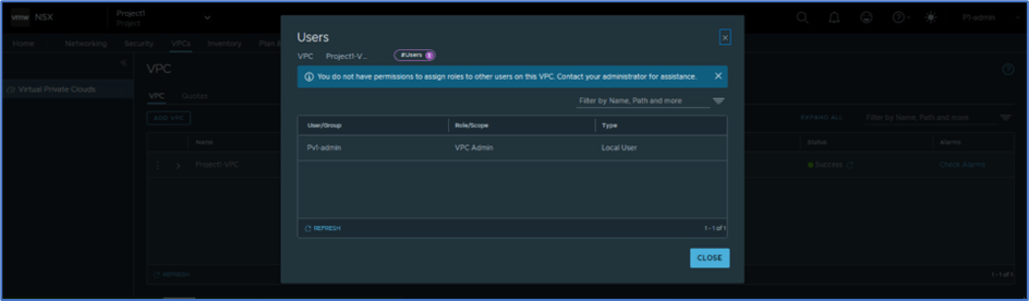 Now Login to NSX manager with Project admin user: P1-admin to validate that User: Pv1-admin has been added to VPC with user role VPC admin.