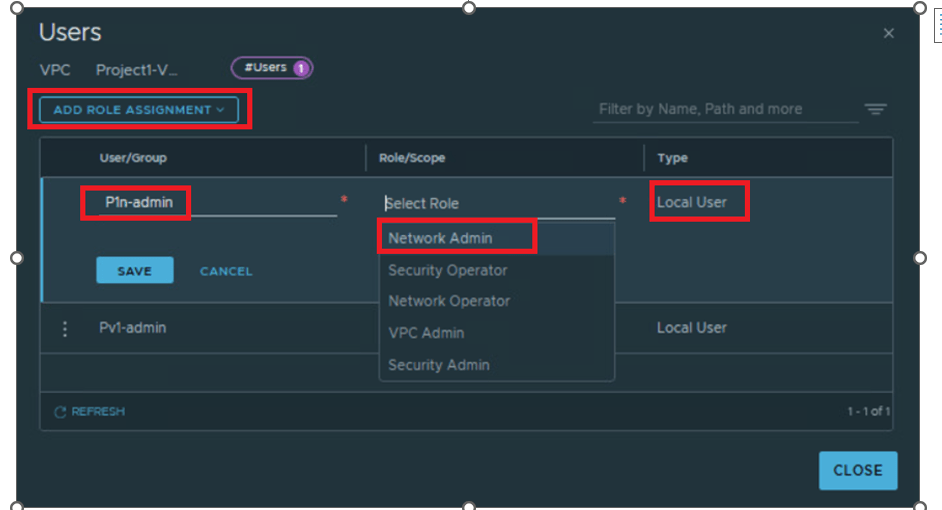 Now we will discuss another option where we will provide access to User role Project admin and VPC admin to add users to VPC. Later we will add users P1n-admin and P1s-admin with role Network admin and Security admin respectively in VPC.