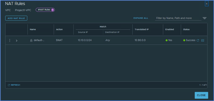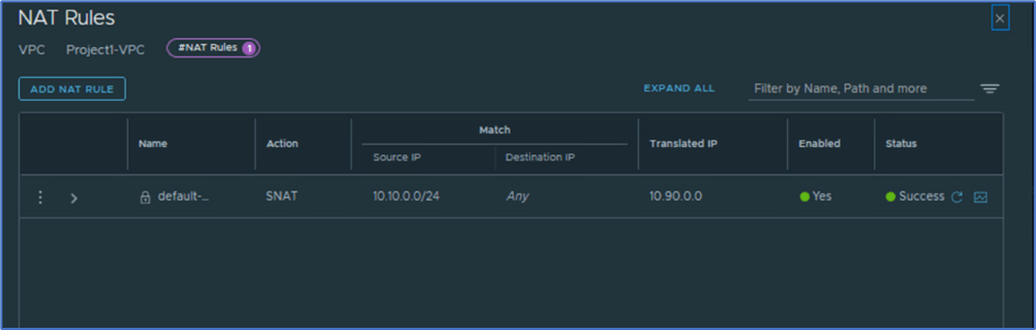 Navigate to NSX>>Networking>>NAT and select Show VPC related objects to get VPC related Tier-1 gateway. You can validate auto SNAT rule information like below where 10.90.0.0 is used for outbound SNAT IP.