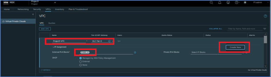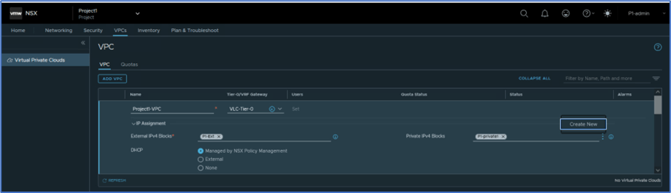 Provide VPC name (Project1-VPC) , Select Tier-0 gateway from list (Inherit T0 router from Project) , expand IP assignment tab and validate that VPC have external subnet (inherit from project) and private IPv4 block is not created.