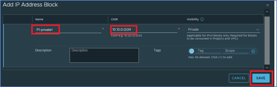 New window will popup and add information IPV4 block name (P1-Private1) , CIDR (10.10.0.0/24) and scroll down and click on SAVE.