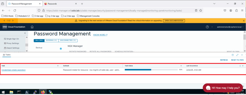 The system will take approximately a minute to process the password update. Once completed, we will retrieve the password using the SDDC Manager CLI to verify that the admin user’s password has been successfully updated in the SDDC.
