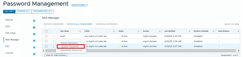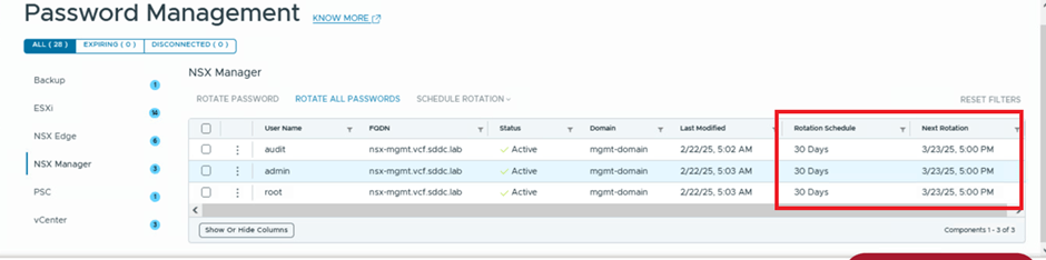 In the screenshot below, you can see that SDDC Manager is managing passwords for three users (admin, audit, and root) for the NSX instance with the FQDN nsx.mgmt.VCF.SDDC.lab. The status for these users is shown as active, indicating that SDDC Manager and the NSX component are in sync. If they were out of sync, the status would display as disconnected.