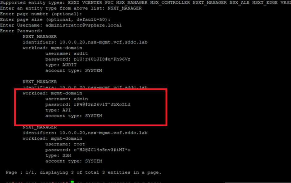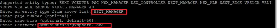Next, enter NSXT_MANAGER as the entity type to proceed. Once you’ve entered a valid entity type, you’ll be prompted to provide the SDDC Manager administrator credentials.