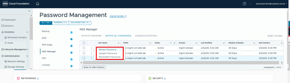 - Password Remediation: Remediate the password for the NSX-T admin user through the SDDC Manager UI.