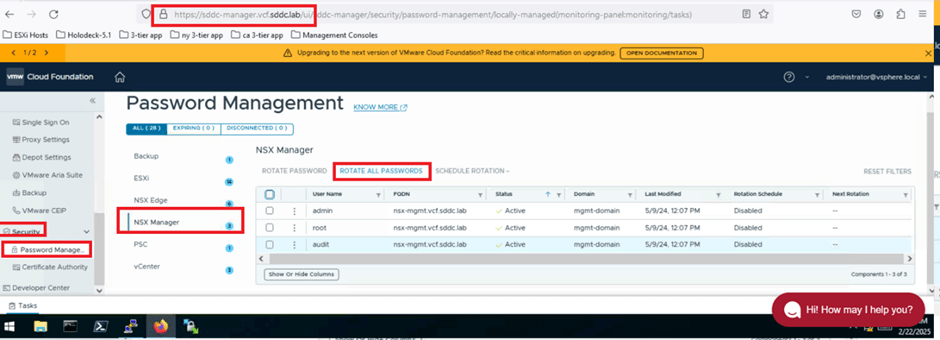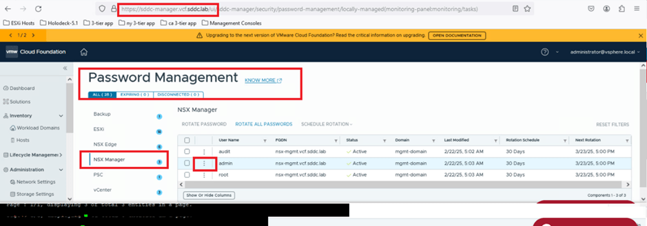 Now, we’ll rotate passwords for all NSX users directly from the SDDC Manager UI. In the previous activity, we retrieved the password (VMware123VMware123!) using the lookup_passwords command. Next, we’ll click on ROTATE ALL PASSWORDS and retrieve the updated passwords for the NSX users. Afterward, we’ll log in to the NSX UI to validate that the password rotation was successful.