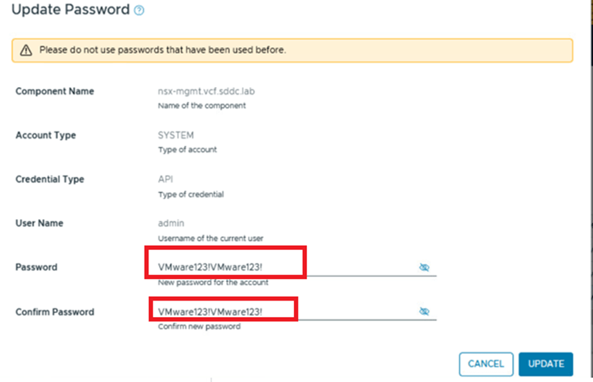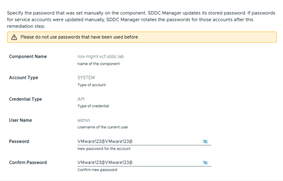 - Password Update: Update the password for the NSX-T admin user using the SDDC Manager UI.