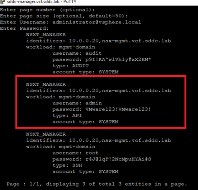 Once the credentials are provided, the system will retrieve passwords for all three user accounts (admin, root, and auditor) associated with the NSX-T Manager.